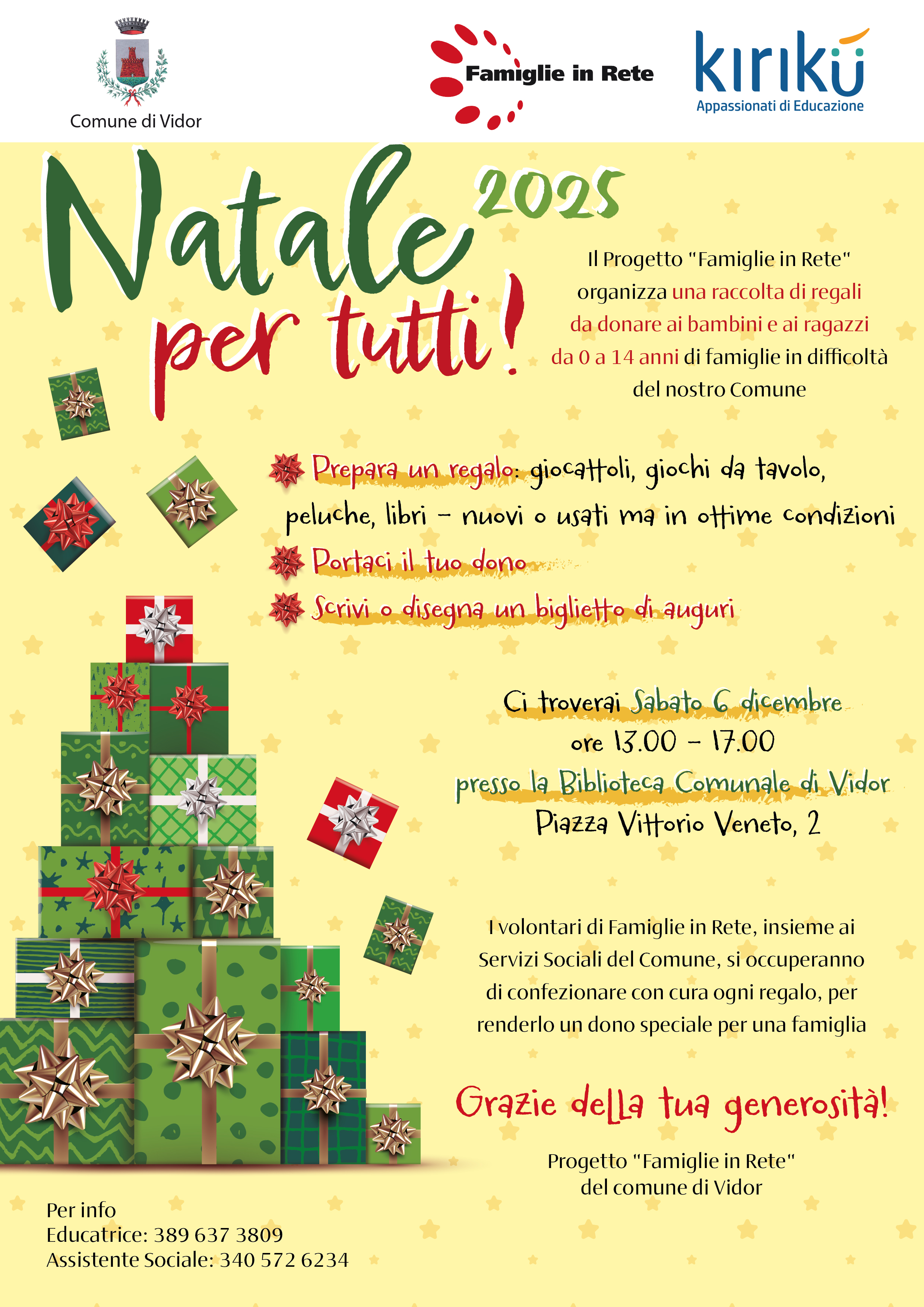 Le Famiglie in Rete del Comune di Vidor vi aspettano per una raccolta di regali per bambini e ragazzi in difficoltà.