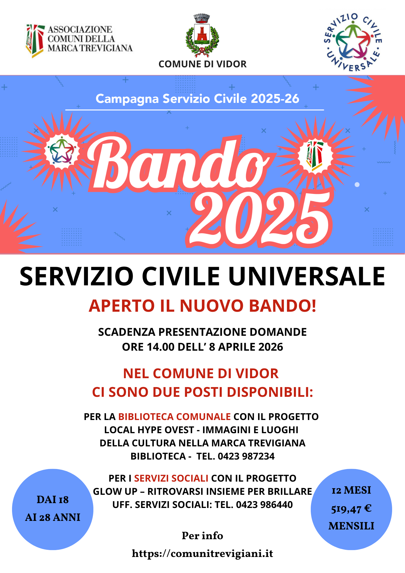 Nel Comune di Vidor sono disponibili 2 posti per i progetti: