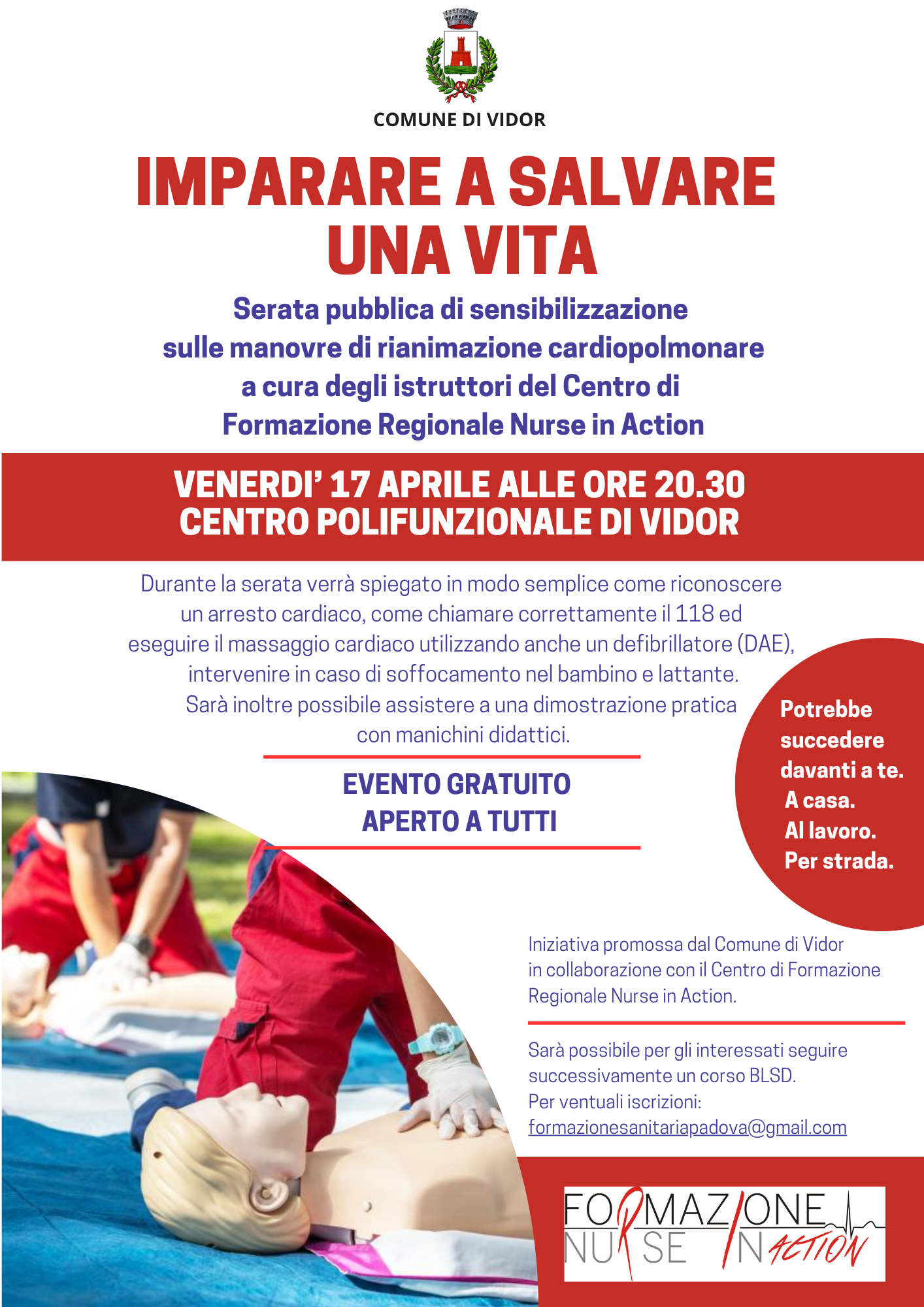 Venerdì 17 aprile alle 20:30 presso il Centro Polifunzionale di Vidor, una serata gratuita aperta a tutti per imparare a riconoscere un arresto cardiaco, chiamare correttamente il 118, eseguire il massaggio cardiaco e usare il defibrillatore (DAE), intervenire in caso di soffocamento nel bambino e lattante.